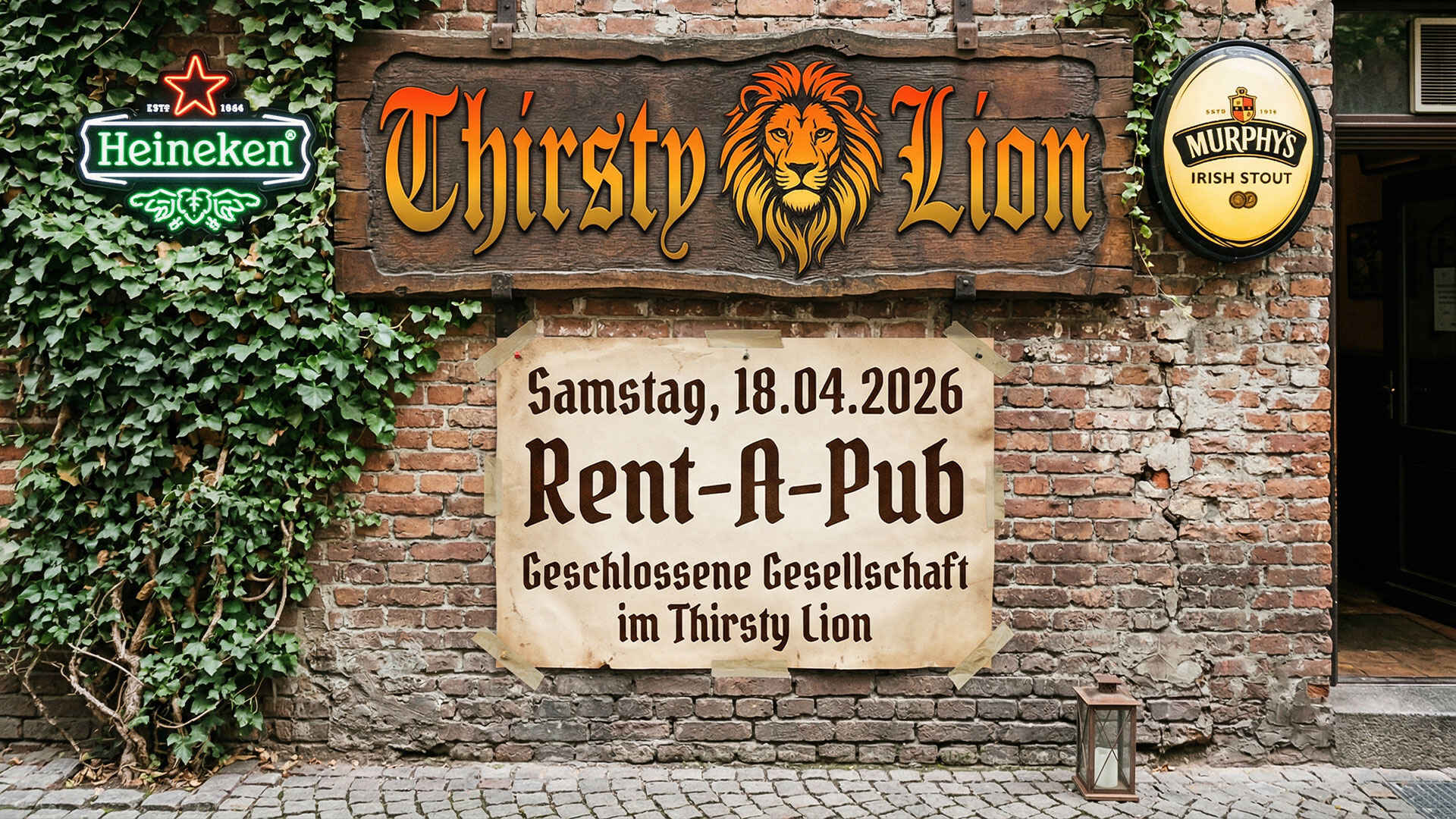 Rent-A-Pub Am Samstag den 18.04.2026 findet im Thirsty Lion eine exklusive Feier statt, zu der nur Gäste nach Gästeliste des Gastgebers zutritt haben. Das mag an diesem Abend für Dich bedauerlich sein, aber vielleicht bist ja auch Du irgendwann mal Gastgeber einer solchen Veranstaltung und freust Dich, dass es die Möglichkeit gibt, den Pub ganz exklusiv für Dich und Deine Gäste zu haben. Sprich mit uns. Wir machen Dir ein cooles Angebot und arbeiten gerne während Ihr feiert. Sat, 11. Apr 2026 -